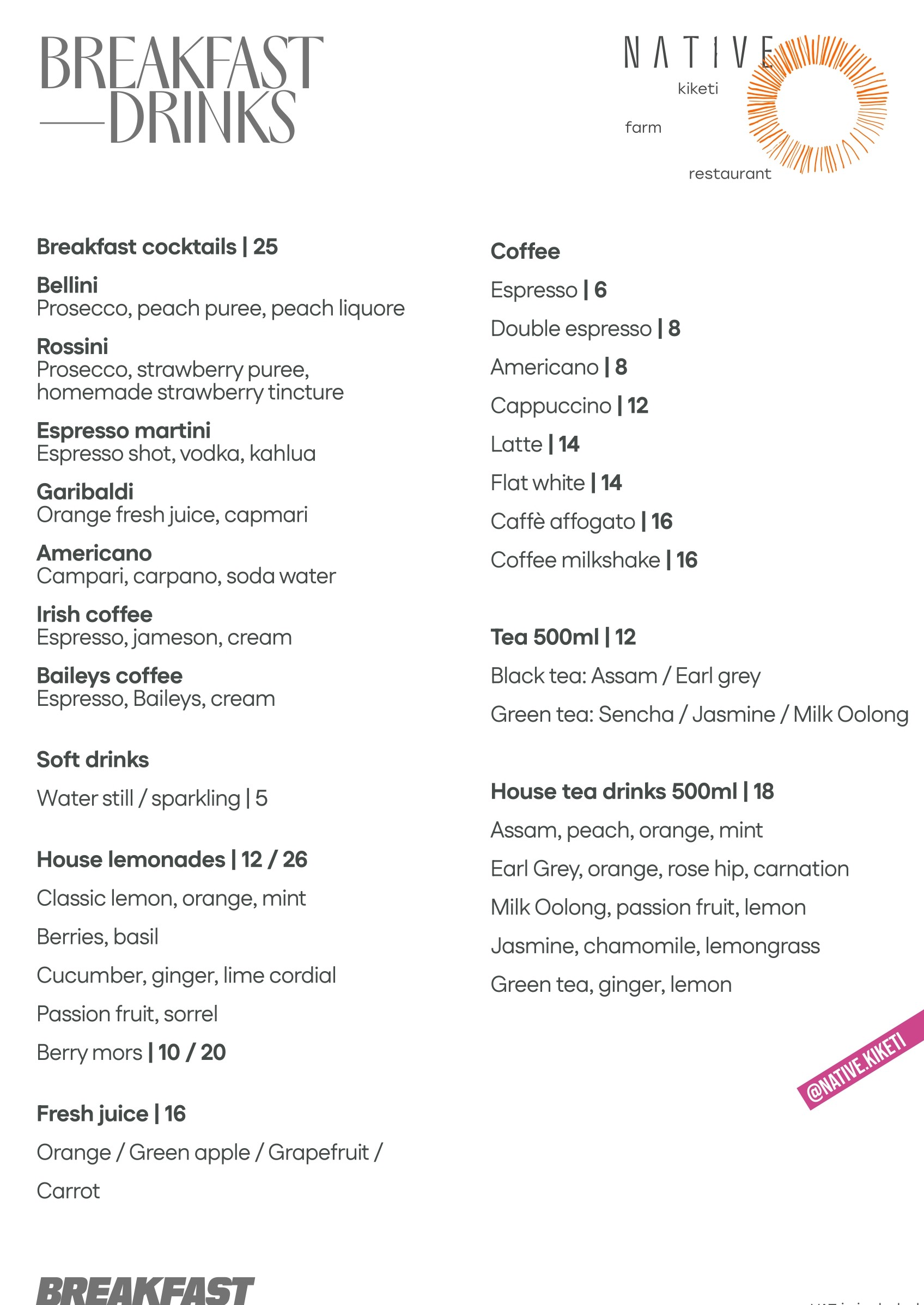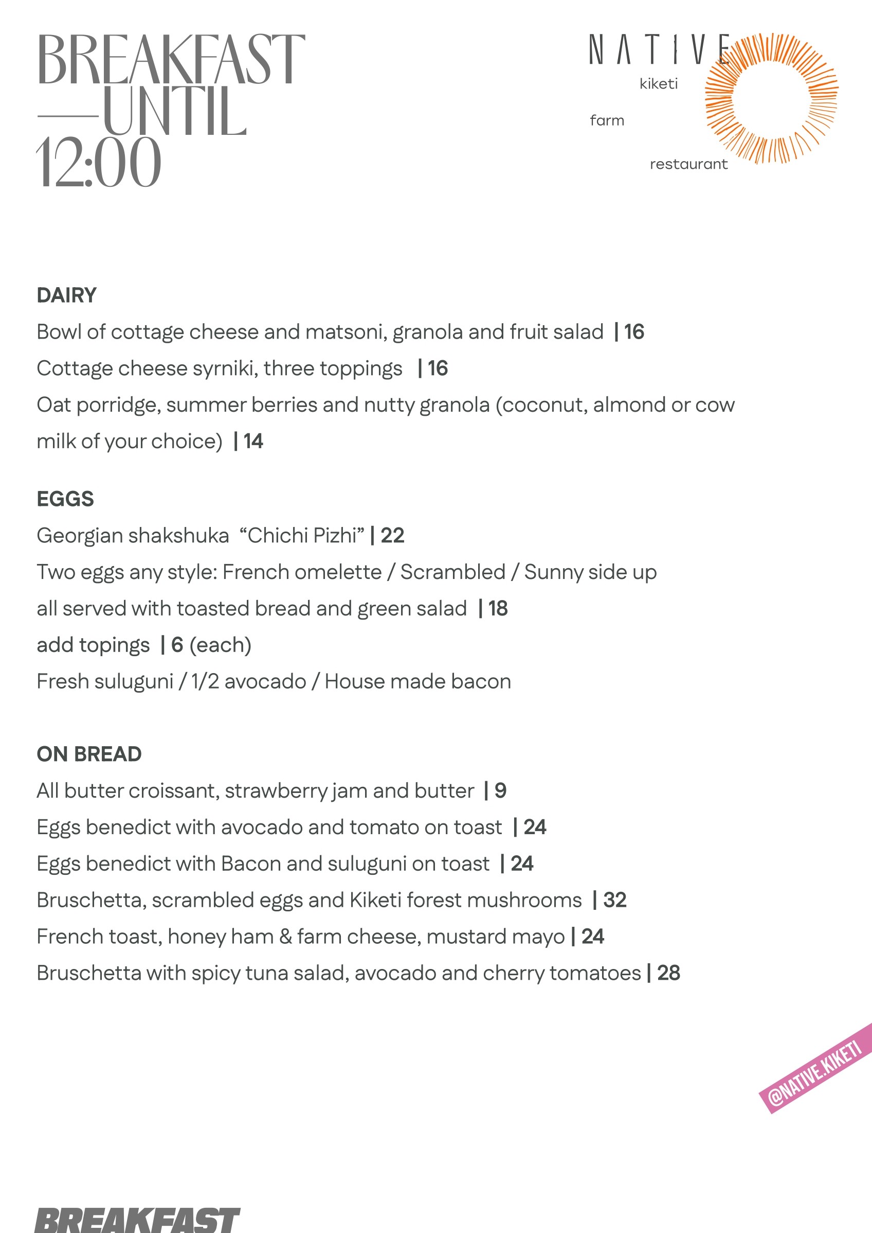 Native is a destination restaurant set on a private farm estate in Kiketi, Georgia, 30 minutes from Tbilisi. We cook with what grows around us — seasonal, local, intentional.